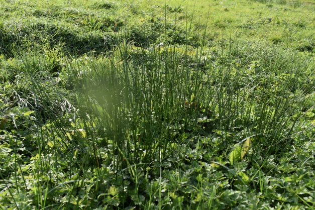 A patch of tall green grass and weeds growing densely on a sunlit, uneven grassy field.